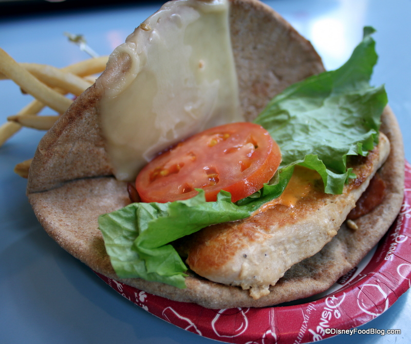 A quick peek inside shows a closer look at all the ingredients in there. There’s quite a bit going on in this sandwich, and the burst of protein from the grilled chicken will keep you going for a few more hours in the park!