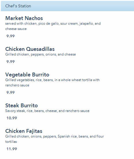 While the restaurant’s popular all-day buffet (and never-ending burritos) is gone, the meal is still a Quick Service credit on the Disney Dining Plan, and the lunch and dinner menus are varied and interesting.