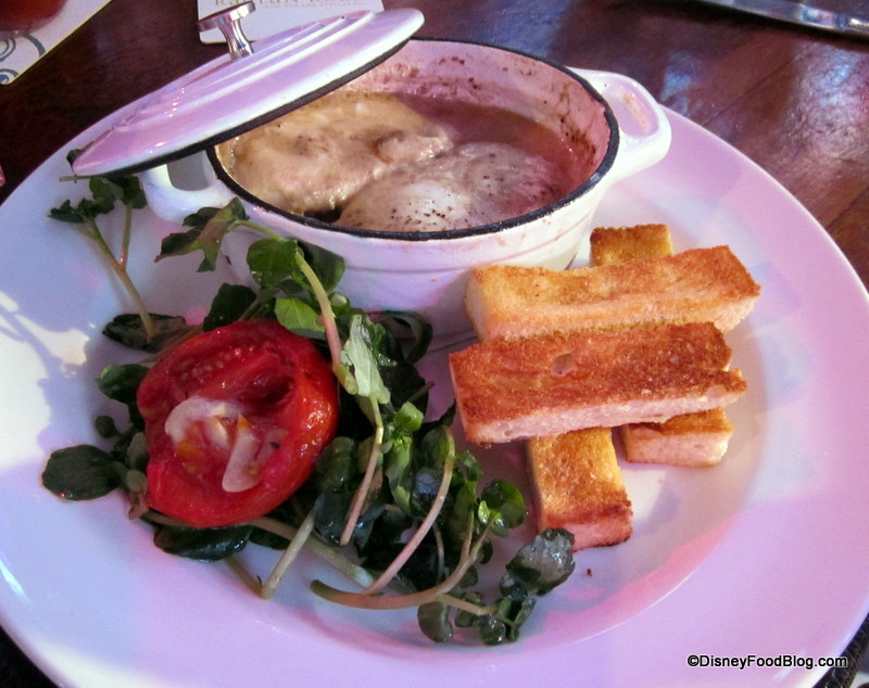 Joni — Yes, the eggs were in a sort of broth, and I believe there were mushrooms, spinach, and cheese in there, with the “toast soldiers” for dipping. It looked quite good! As for a side, there weren’t any meat sides available on the menu that I saw, but that could always change! And a request may very well be accommodated.