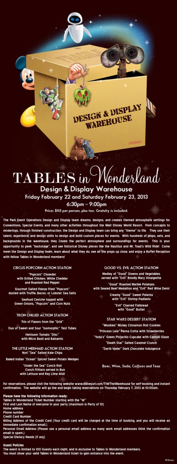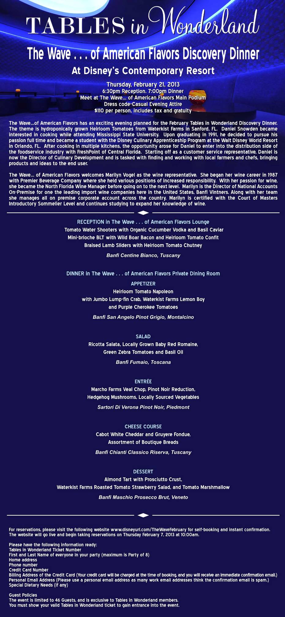 Fun updates for Tables in Wonderland members! Tables in Wonderland has announced a Discovery Dinner at The Wave…of American Flavors at the Contemporary Resort and a Special Event at the Design & Display Warehouse for February. Both are NOW available for booking!