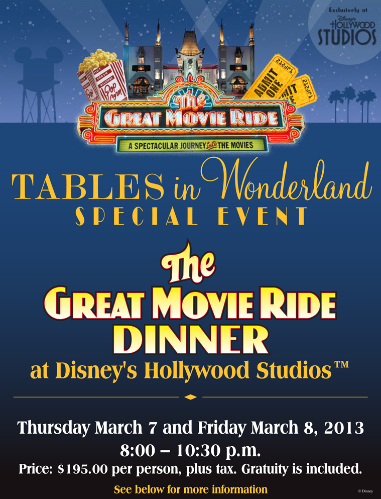 Tables in Wonderland has announced The Great Movie Ride Dinner taking place in Disney’s Hollywood Studios on March 7 and 8, 2013! Check out an AWESOME review of this experience here!