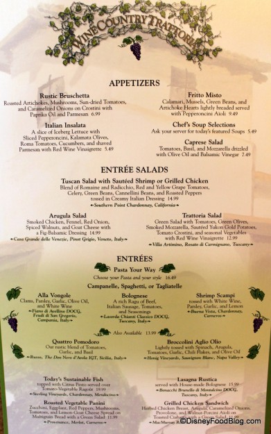 The Wine Country Trattoria is my favorite moderate table service restaurant at the Disneyland Resort (including Downtown Disney). For just a few dollars more than a counter service meal, you can enjoy some familiar but well-executed and very nicely presented Italian favorites.