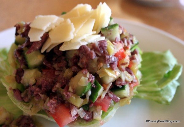 My husband chose the Italian Insalata. Cradled inside an iceberg lettuce leaf, the chopped salad consisted of pepperoncini, Kalamata olives, tomatoes and cucumbers.