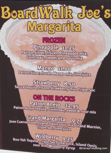 Along with specialties that pop up, BoardWalk Joe’s serves up Frozen Strawberry, Frozen Mango, Frozen Pineapple, Wildberry, Frozen Grand, and Patron Anejo margaritas. Prices currently range from $6.50 – $12.95.