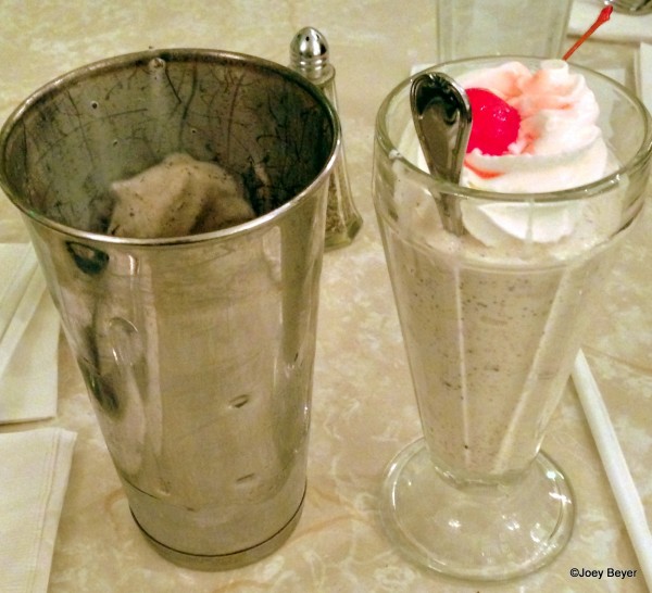 I went for the Cookies and Cream Shake, and in true old school ice cream parlor fashion it came in the traditional glass along with the extra shake in the metal mixing cup.