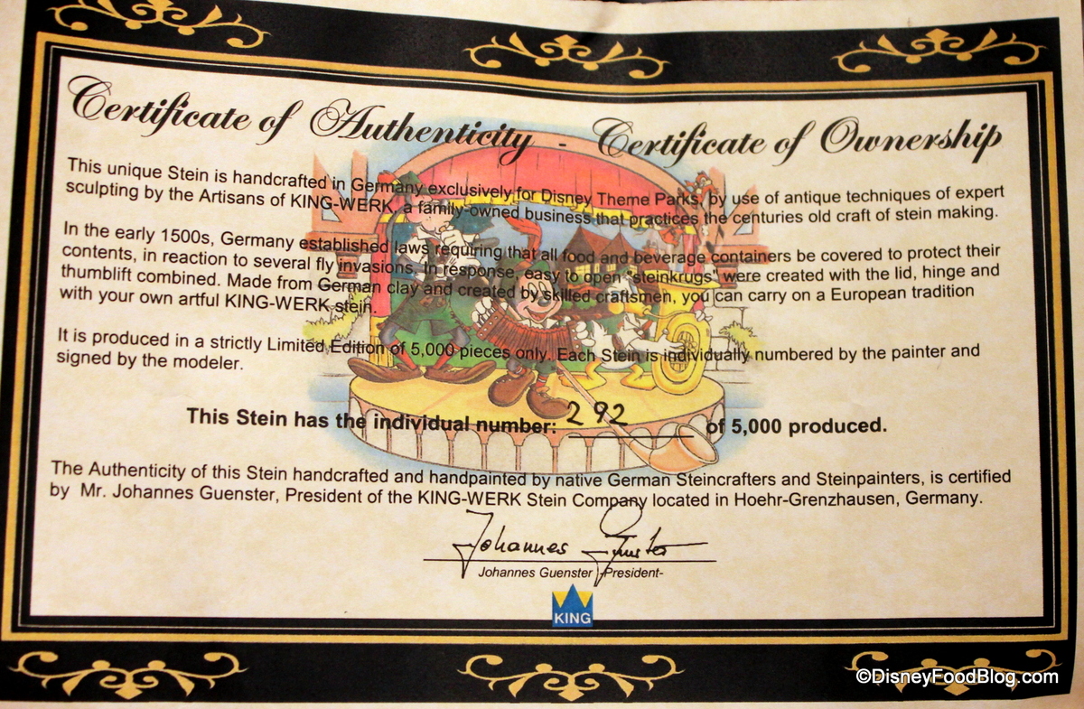 Each of the tankards comes with a Certificate of Authenticity, which gives a brief history of the designs of the steins themselves (did you know why they had lids? I didn’t!). It also provides the number of the stein. Limited to a lot of 5,000, these are true collector’s items.