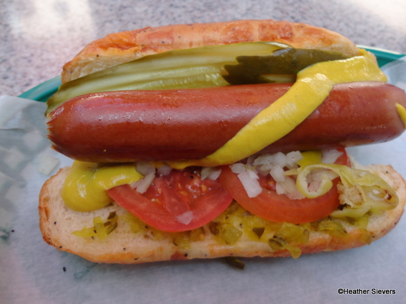 This all beef Kobe, Chicago style hot dog is served “In a Cheddar Poppy Yellow Roll with Dill Pickles, Tomatoes, Onions, Pepperoncinis, and Sweet Emerald Green Relish.”