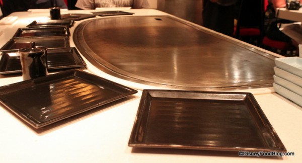 Your pager will go off eventually (it didn’t take long for ours), but because Teppan Edo seats guests at communal tables, you’ll have to wait until all of the guests sharing your table (even if you don’t know them) have presented at the podium. More on the communal eating later!