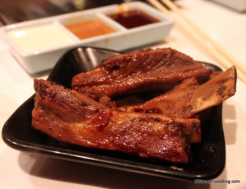 Pork ribs are braised in a combination of sake, soy sauce, and ginger before they are finished on the grill. The searing heat caramelizes the glaze, making for a delicious starter. (You can see the sauces in the background, too!)