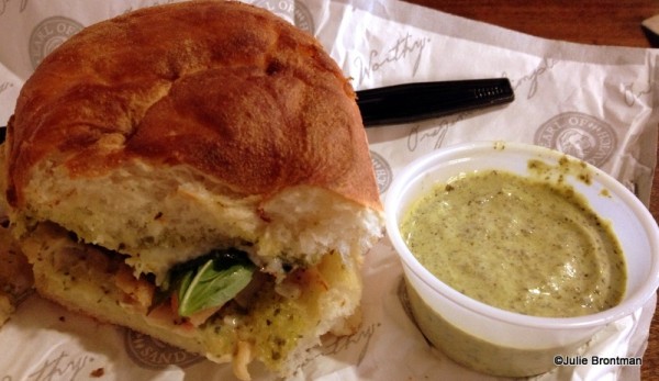 The pesto spread on the sandwich is more like a creamy pesto, almost a cross between a thin mayo and a traditional pesto. I was impressed by the flavor! And definitely ask for an extra side of this — it was perfect for spreading. (Who am I kidding, I dipped the sandwich right into the pesto!)