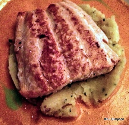 I ordered the vegetable quiche (very good) and potato leek soup (delicious); and in the spirit of research, I also ordered the only seafood offered at lunch: the Seared Mahi Mahi children’s meal.