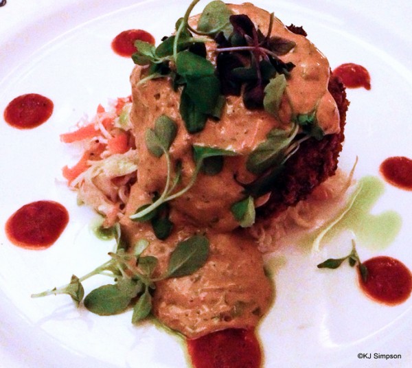 I started with the Signature Flying Fish Crispy Maine Coast Jonah Crab Cake. The crab cake is served with a savory vegetable slaw, roasted red pepper coulis, and ancho chili remoulade.