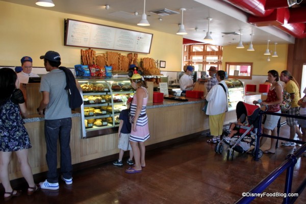 The cafe displays some of the menu options so you have an idea of meal size before you order. In addition, there’s a bakery case with several tempting bakery and pastry options, most of which are familiar Disney favorites.