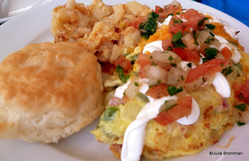 My dining partner ordered the Sombrero Beach Omelet— an omelet with ham, green pepper, onion, and cheddar cheese, all topped with sour cream and pico de gallo. Our waitress described it as Olivia’s version of a Western Omelet. This omelet was fluffy and huge with wonderful flavor.