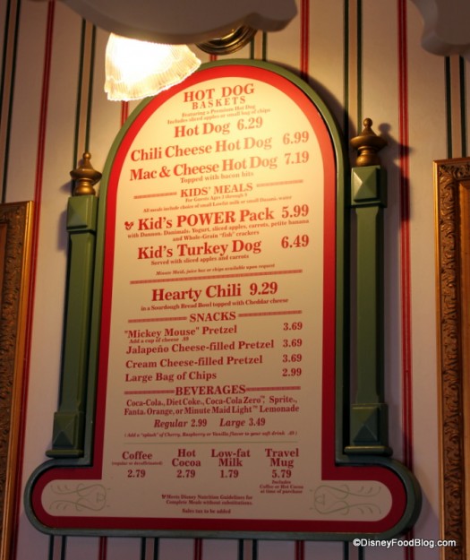 This spot will remind East Coasters of Casey’s Corner with its decor and location. With a nod to early twentieth century vintage, this spot anchors Main Street U.S.A. with lots of charm as well as good eats.