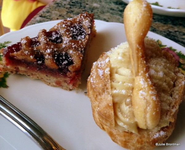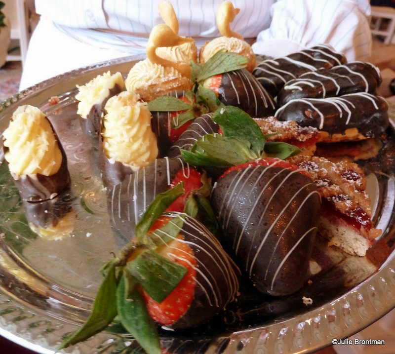 They presented a tray of desserts and let us pick two. Choices included: chocolate covered strawberries, coconut mousse in chocolate shells, raspberry linzer tortes, chocolate éclairs, and Bailey’s mousse swans.