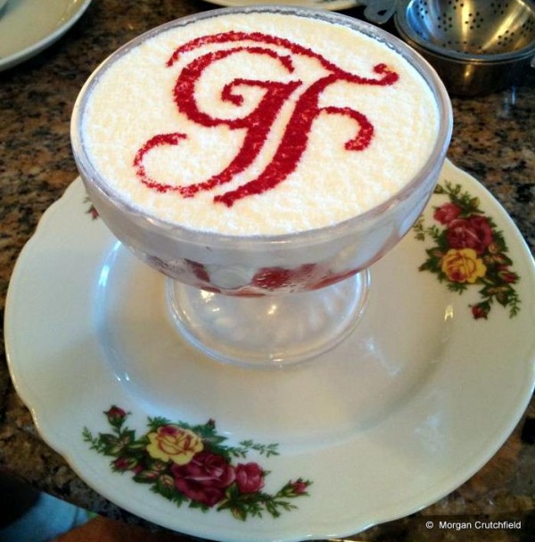 Have they changed the trifle out for strawberries and cream now? I love the trifle! This would be a sad substitution, though strawberries and cream are good, too. The trifle was served to look exactly like that, with the GF on top.