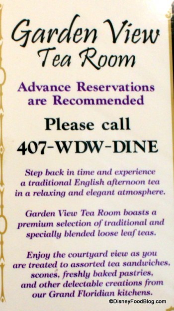 I am just back from a week-long trip to WDW with some sad news about the tea at the Grand Floridian. They no longer offer any a la carte options on the menu and our server said that only the cheese plate was available by itself. He said this was a VERY new change. I was quite upset because there are also only two “teas” on the menu that do not come with an alcoholic beverage; these being a version of the “Gentleman’s Tea” and the children’s tea. Want scones and pastries? Pay for a glass of champagne as well!
