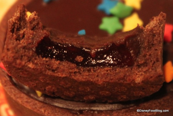 I not only tasted the super sweet chocolate, but also a tart, fruity flavor! Looking inside, I found that there was an entire layer of raspberry jam hidden beneath the ganache! Who knew?