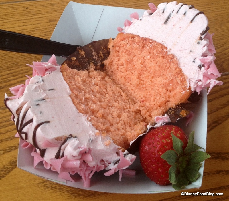 While hanging out in Disney’s Hollywood Studios last week, we were super psyched to see a brand new Disney cupcake that has debuted for the Summer in the park — the Strawberry and Cream Cupcake!