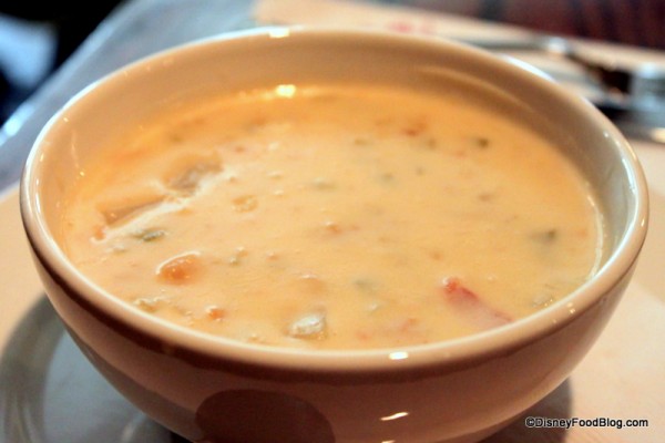 It’s a New England style clam chowder, which means it’s made with milk and ends up creamy instead of brothy in the end. This delicious goodie has been a staple on the Liberty Tree Tavern menu for years, and it’s a guest favorite.
