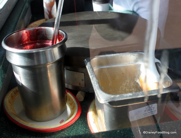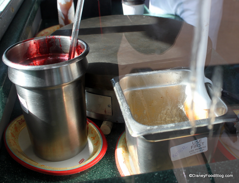 One of the best part of this little kiosk is that you get a show while you wait! Inside the stand, you can see the crêpe griddle, where the thin batter is ladled and worked to form the basis for your treat. A container of Strawberry Preserves stands at the ready for saucing.