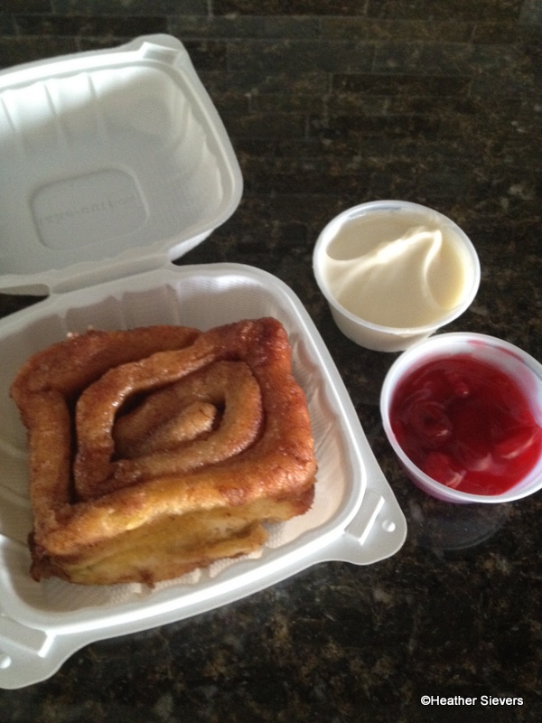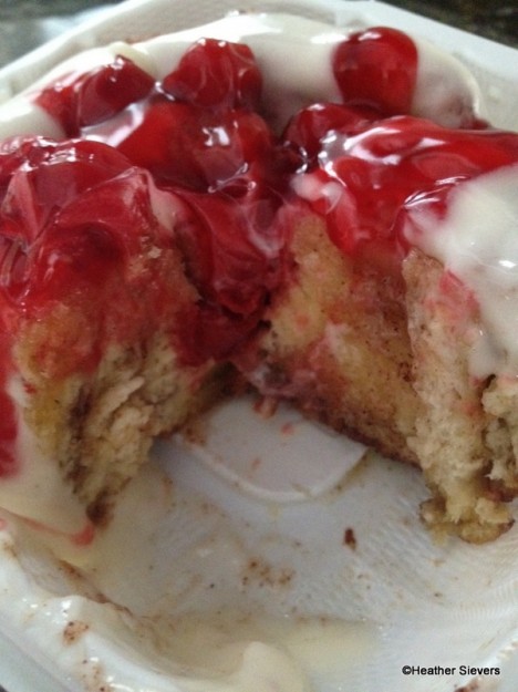 After dinner, I opened up my container, set my cherries and frosting aside & stuck the cinnamon roll in the microwave for 45 seconds. I did it for 30 first and it wasn’t quite warm enough, so I zapped it for another 15. Probably depends on the strength of your microwave. The employee at the stand told me 30 seconds, so maybe he has a stronger microwave…