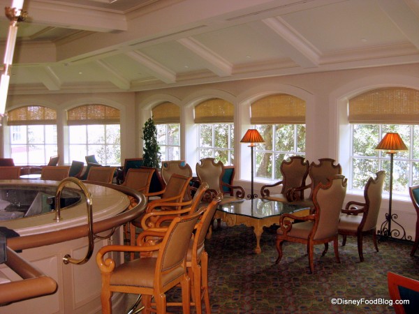 Potted palms and ornate carpets hint at the Victorian theme. Rather than heavy furnishings, you find lighter woods with a woven touch. It’s relaxed, but still feels a little dressier than most Disney lounges.