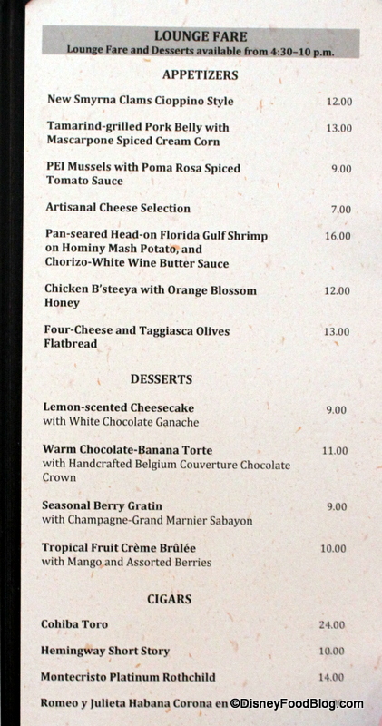 But in addition to the relaxing, refined atmosphere, Mizner’s Lounge also has some really delicious small plate offerings. Tambu Lounge at the Polynesian and the Territory Lounge at Wilderness Lodge have both recently been the setting of some really enjoyable tapas-style encounters lately. Would Mizner’s be equally as fantastic?