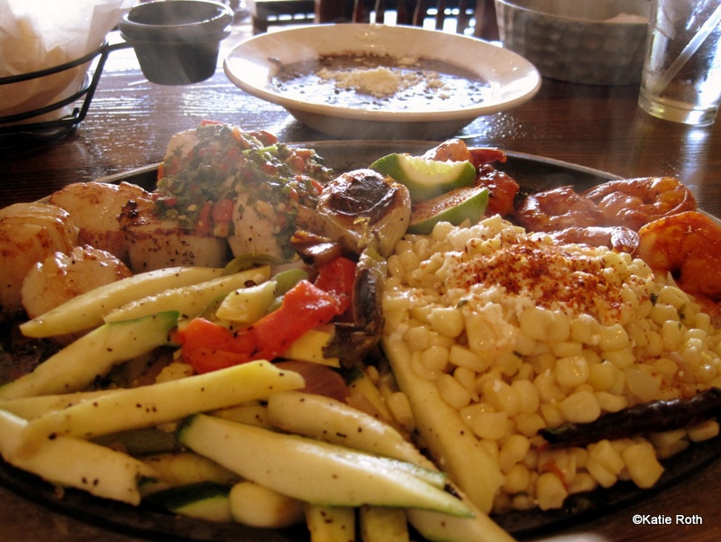 A huge, sizzling skillet full of sautéed veggies, sweet corn, shrimp, and fish topped with fresh salsa, and scallops with accompanying bowls of rice and beans dominated the footprint of our entire 4-5 person table. And this was all just for the two of us! 🙂