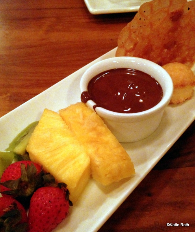 One of our desserts was the chocolate fondue accompanied by fresh fruit, coconut macaroons, and peanut brittle. The fondue itself was super rich and reminded me of melted chocolate chips.