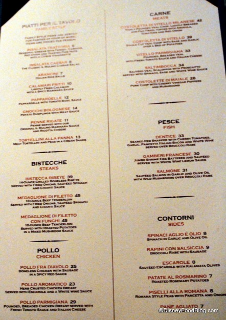On the second page you see a full offering of various entrees, but this is where you’ll also find the restaurant’s “Piatti Per Il Tavolo”, or family-style, section.