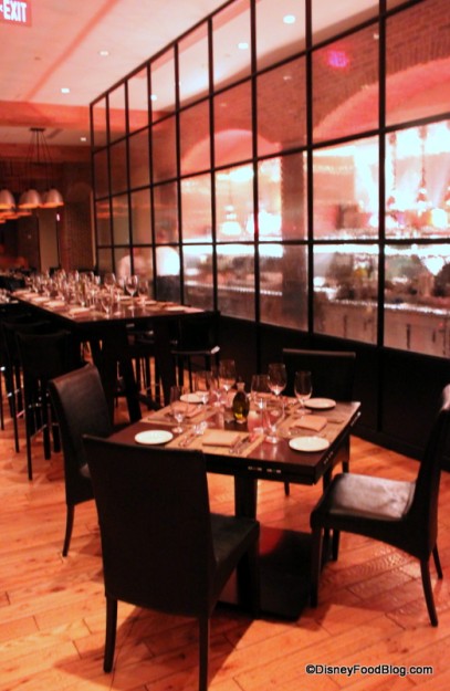 As you pass from the bar into the main dining room, you get more of that industrial-meets-rustic feeling that I told you about earlier. This wonderful, multi-paned glass wall separates the kitchen from the dining room. You see the action, but you’re still a little removed from it.