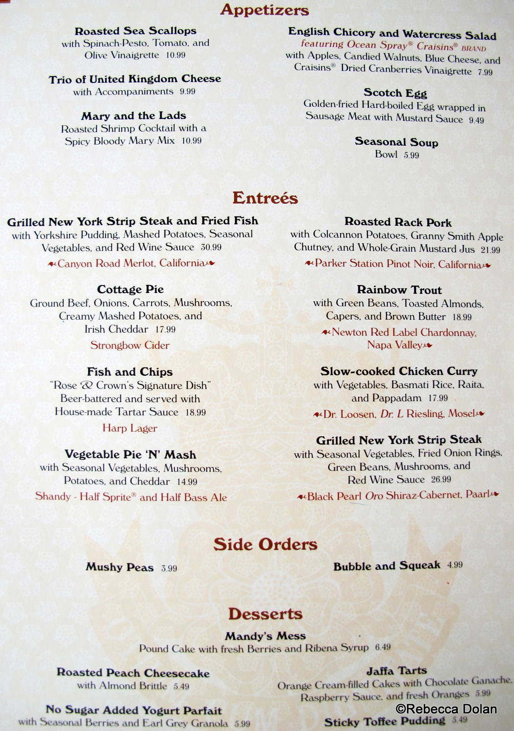 British food may not have the most exciting reputation. But, in my experience the food on offer at Rose & Crown has always arrived at the table hot, for the most part cooked perfectly, and the wait staff is amazingly friendly. These points weigh heavily with me, and are a big part of why I like to recommend this restaurant. There are plenty of Disney restaurants that can be spotty with their food and service. This is not one of them.