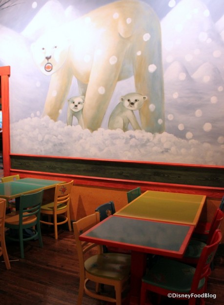 A long shot of the seating in the main dining rooms shows you how the murals fit together. Open rafters make for another fun design touch…