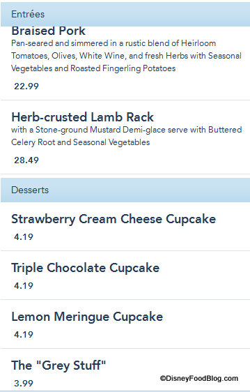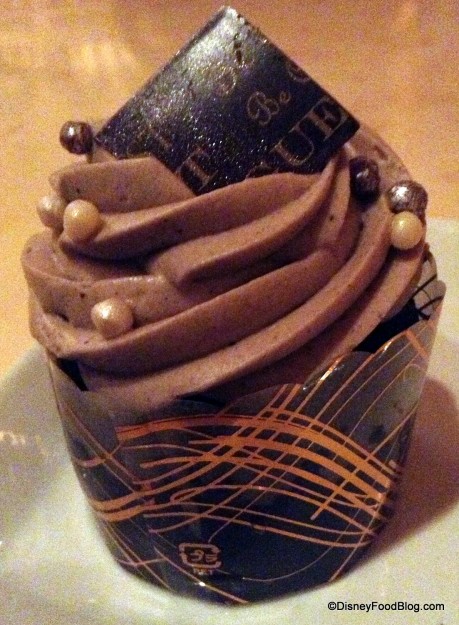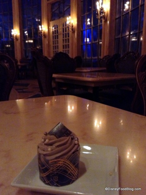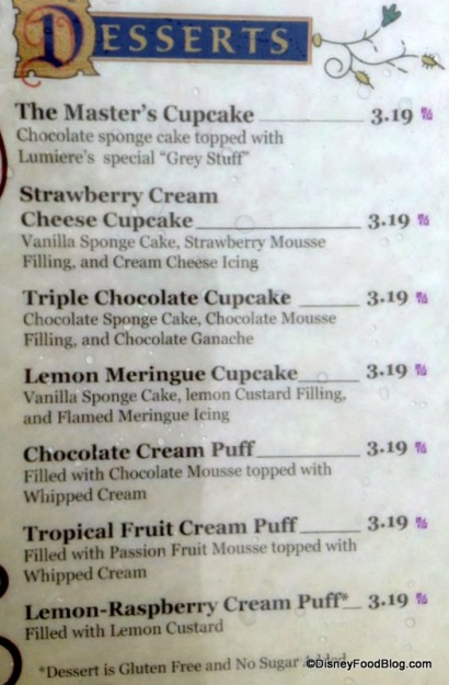 Yep — the grey stuff (which is actually a cookies and cream panna cotta that’s been whipped into a creamy dessert) tops a chocolate cupcake in the Beast’s castle these days! It’s the same price and size as all lunch cupcakes: $3.19, and you can get it for a Disney Dining Plan snack credit. It’s now the top dessert item listed on the menu.