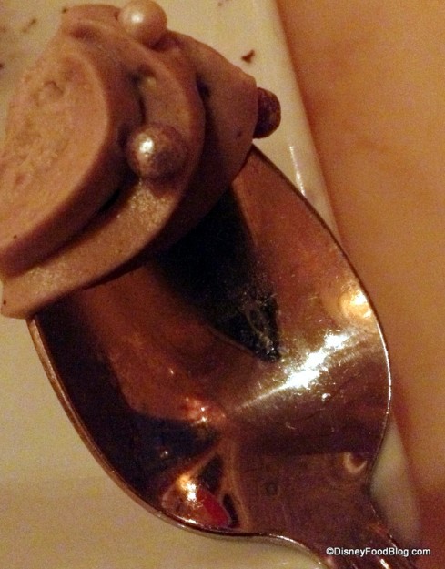 The base is moist chocolate cake with a huge, lovely mound of Lumiere’s Grey Stuff on the top (it ends up being more than what you receive at dinner), complete with the little sparkly, crunchy garnish and a decorated chocolate topper.