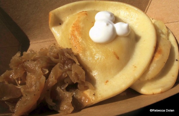 According to the chefs at the Poland booth, everything about the potato pierogies with caramelized onions and sour cream is vegetarian, except for the addition of sliced kielbasa sausage. The sausage can easily be left off, but strict vegetarians should note that the sausage is cooked on the same griddle as the rest of the components. (Editor’s Note: Do I detect a Hidden Mickey in that dollop of sour cream?)