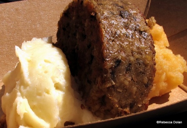 Scotland: And now for my favorite dish: the vegetarian haggis with neeps and tatties. (That’s rutabaga and mashed potatoes to the non Scots.) The thick slice of haggis is best likened to savory oatmeal studded with veg, featuring that pleasant chew that only perfectly-cooked steel cut oats can muster. The extra-creamy mashed potatoes on the side didn’t hurt anything either.