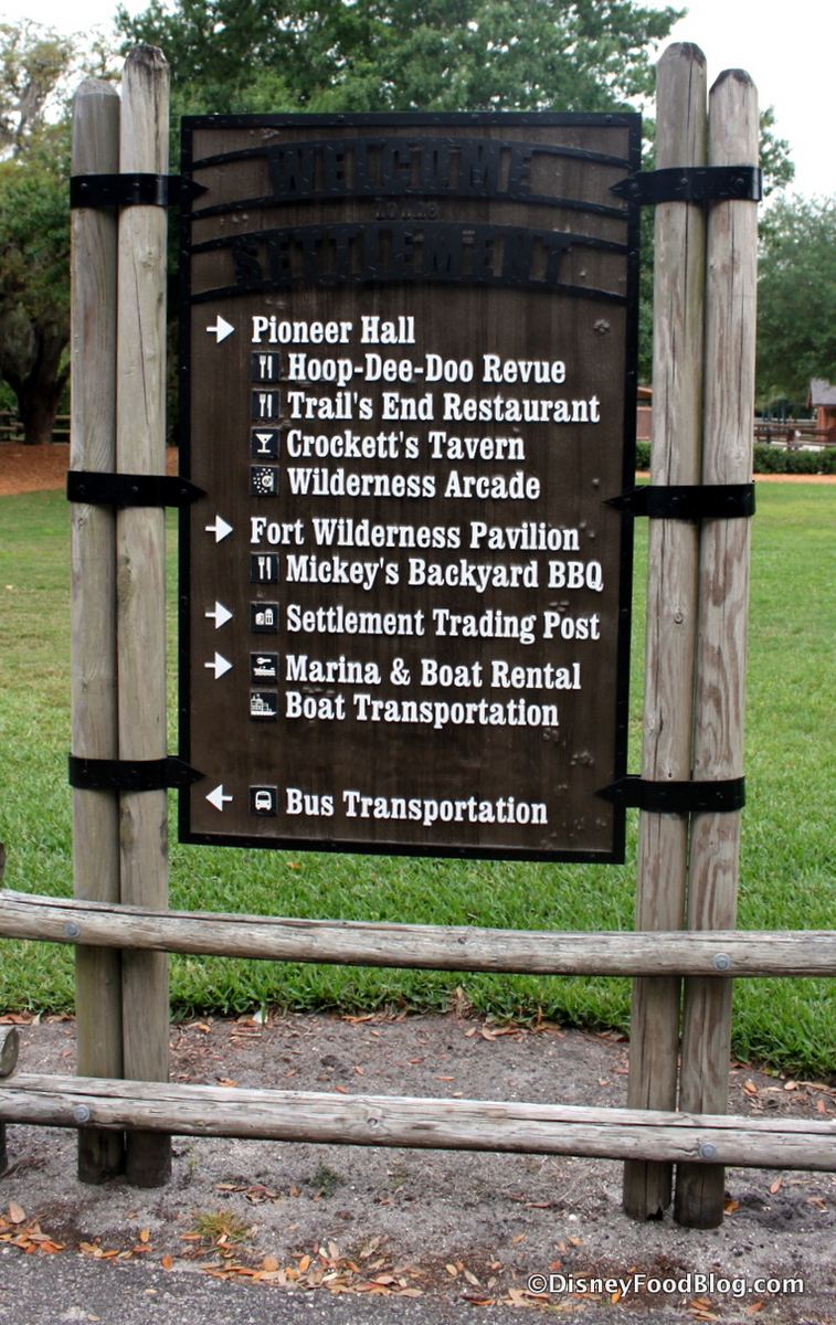 If you’re coming here via bus from a theme park, or via your own car, you’ll park way up at the front of Fort Wilderness and have to take some internal buses to get back to the Settlement. That’s why I prefer to get to Trail’s End and the other Fort Wilderness restaurants via boat from Magic Kingdom, Wilderness Lodge, or the Contemporary — much less intensive on the travel end, and more enjoyable as well.