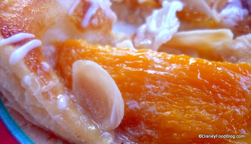 I was expecting an almond taste to the pastry from an added extract, but the almond flavor was purely from the shaved almonds themselves. I enjoyed the pairing of the nuts with the mango — they lent a nice crunch to the softened fruit, and the icing delivered just enough sweetness. It’s definitely one of the more unique pastries I’ve seen in the Disney Resorts.