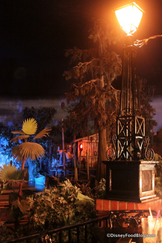 Besides giving you a glimpse of the Pirate boats, these seats also get you closer to the water and the bayou that lends the restaurant its name. Just take in the detail of the ornate lamps and the cypress tree. Incredible!
