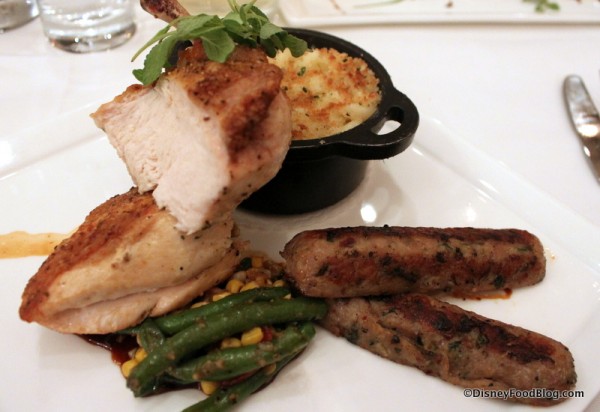 I am SHOCKED about the chicken! My mom and I both got it and it was amazing. I would get it again in a heartbeat. Everything was super flavorful and the mac and cheese on our night was not dry at all. Dad got the scallops and loved those too. Other items that night were the duck app, goat cheese ravioli app, tomato salad app, sundae sampler, seasonal sampler and the chocolate cake. Also had sake martinis and mai tais (YUM). Everything was outstanding. Loved that we went outside to watch the fireworks and came back to a freshly set table with dessert menus. Still holds as my top favorite restaurant at the world!