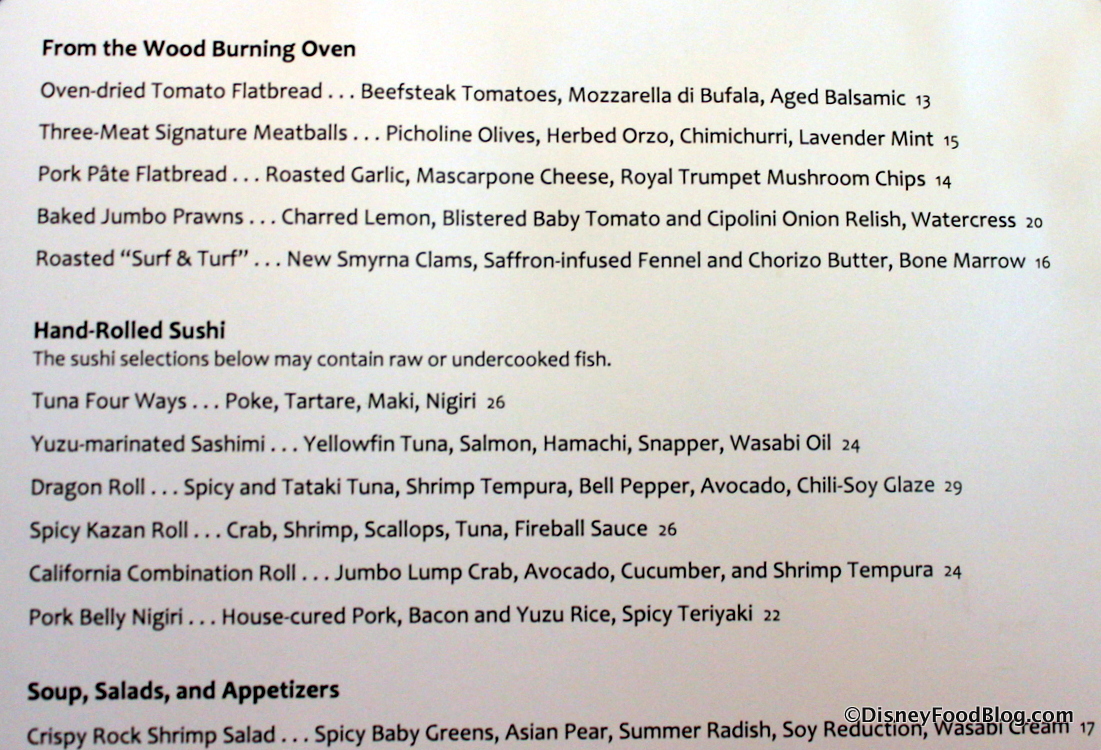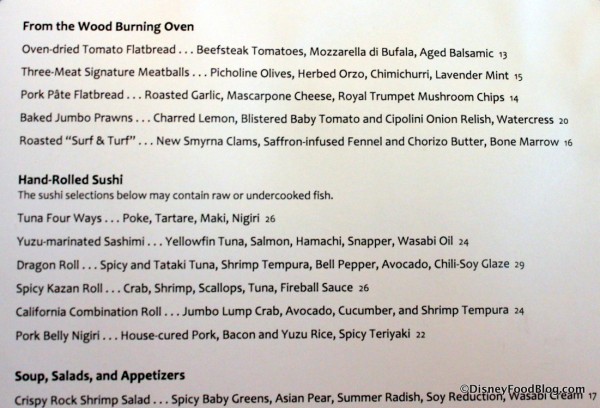 AmyW – I went in December 2012 (prior to the renovation) on the Deluxe Dining Plan and anything above entree was considered an appetizer to include flatbread, soup or salad. I am not sure about the sushi as I don’t eat sushi (I know I am weird). So yes, you can pick out an appetizer, entree and dessert. (It becomes a ton of food if you are there awhile – our trip was 10 days!).