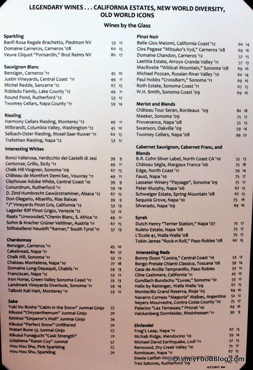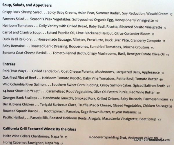 We just got back from DW. We ate at the California Grill for our 10 yr annivesary, we hadn’t been there since 2004! We were on the basic dining plan which included the entree, drink, & dessert. Our reservations were at 7:20, we we arrived a few minutes early & only waited maybe 15- 20 minutes before we were seated. We requested a window seat at check in & to our surprise had the perfect view of the lake & MK! Our server was very polite & checked back with us frequently! We recieved the bread, it was the foccia & wheat rolls. The wheat rolls were so hard! I felt like a cave woman trying to tear/bite a piece off! The foccia was very soft & yummy. For our entrees I ordered the oak fired filet & my hubby ordered the Bison tenderlion. Both arrived quickly & perfect. Both meats were tender & the sauces were delish! I had the tomato risotto, first time I’ve ever ate that, now I want the recipe, it was great! My filet was so good! The bison was great too but came with some kind of veggie mix & brussel sprouts (yuck!) Dessert was good too. We ordered the chocolate cake, super rich, and the fritters. The fritters were ok, wasn’t crazy about the banana flavor. The server timed our desserts perfect, just as the fireworks were beginning! The atmosphere was ok, it was loud. There were quite a few children there which surprised me & I saw a few questionably dressed people. Being the kind of restaurant it is, fancy schmancy, I didn’t expect so many kids & guys in jeans & tshirts. But we just turned our chairs toward the windows & tuned it all out. Turned out to be a pretty romantic evening away from our kids! I would only recommend this place if you’re using the dining plan, particularly if you get it “free”! It’s a bit pricey! Oh, & the menu changes, the one pictured was not the current one when we visited Sept. 25, 2014!