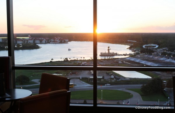— A beautiful sunset through the picture windows directly ahead of you. I was lucky on this visit, as I got to see both the sunset AND the fireworks through those floor-to-ceiling windows!