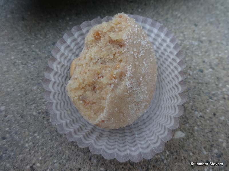 But I was way wrong. Moist, dusted with sugar and topped with a peanut, the cookies reminded me of a peanut butter cookie dough ball. Not squishy like an uncooked ball of dough, but sort of half baked and mixed with chopped peanuts.