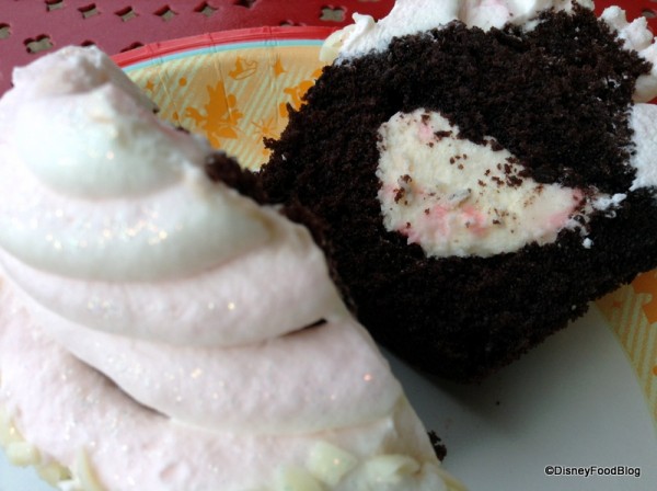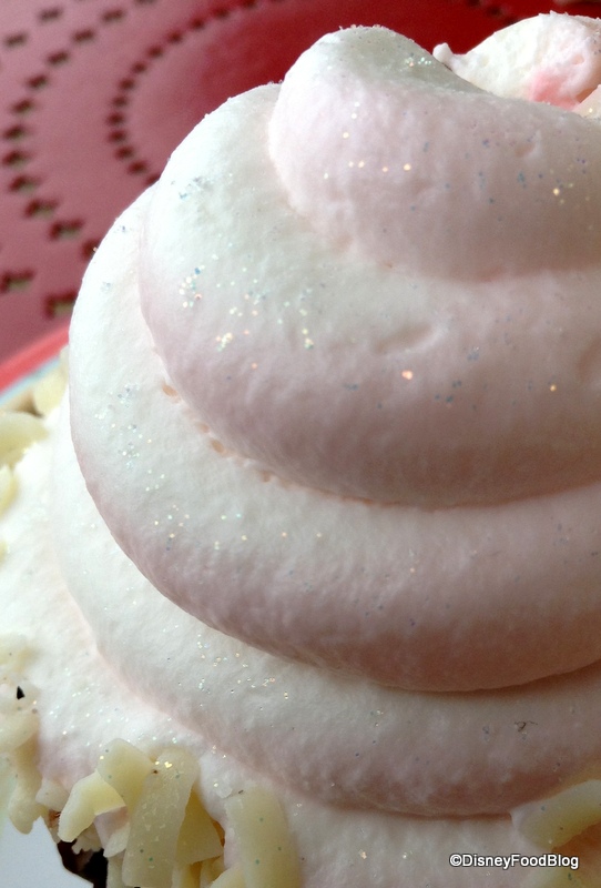 I had this cupcake last week, and LOVED it. I got it to go and even after sitting in our room fridge for several hours it was amazing. I loved that the icing was fluffy and creamy versus super heavy and sweet. To be honest, I also loved that it sparkled ;-)! The filling was a star for sure, and those pieces of bark on the top were great! It was my favorite cupcake of our trip!! Yum!