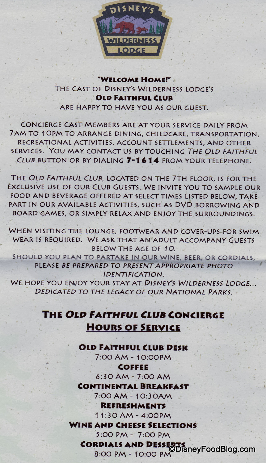Welcome Guest Reviewer James Armstrong! Today, we get to see the concierge’s food amenities at the Wilderness Lodge in Walt Disney World. Let’s head to the Old Faithful Club!