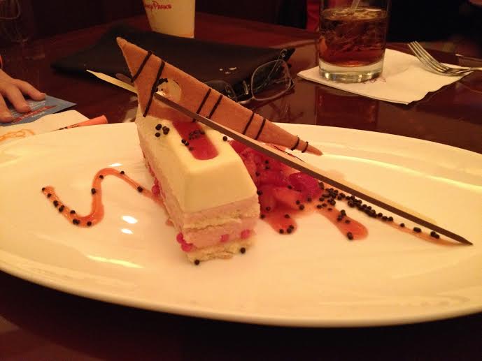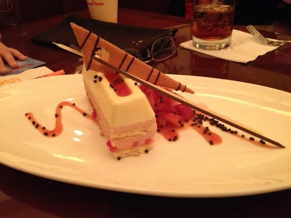 Reader Claire emailed this message: “This was a yummy dessert at Hollywood Brown Derby. I believe it was called Strawberry Champagne cheesecake with dark chocolate ‘caviar.’ Quite the funky looking dessert, although it had more of a mousse texture to it than cheesecake.”
